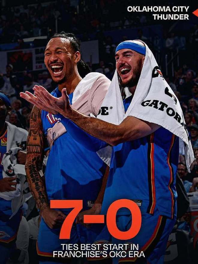 再往后,雷霆繼續(xù)順風順水擊敗老鷹、獨行俠、國王、奇才與鵜鶘,從而成為新賽季至今唯一保持全勝戰(zhàn)績的球隊。雷霆連續(xù)兩個賽季開局7連勝,成為歷史第3支做到該點的球隊。