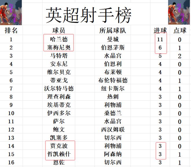 射手榜方面,哈蘭德11球遙遙領(lǐng)先位居榜首,塞梅尼奧6球排在第2,馬特塔5球排第3。賈克波3次中柱后破門,追上?;倏?,哲凱賴什等人10球剛好擠入前十。開場(chǎng)山脊破門的姆貝莫?jiǎng)t是還差1球,才能進(jìn)前十。