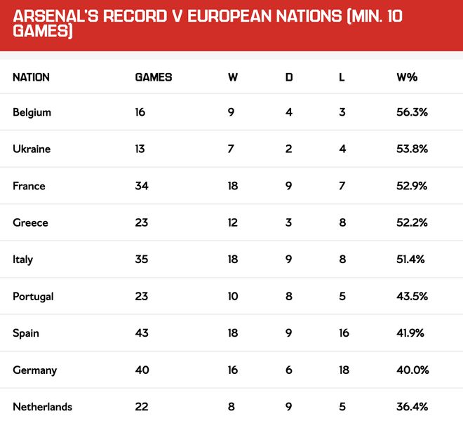 歐冠對(duì)西甲球隊(duì)6連勝后,阿森納對(duì)西甲球隊(duì)的勝率已經(jīng)超過(guò)40%,達(dá)到41.9%。如若此番擊敗馬競(jìng),阿森納將第19次擊敗來(lái)自西班牙的球隊(duì)。而西班牙也將正式成為阿森納取勝次數(shù)最多的聯(lián)賽國(guó)別。